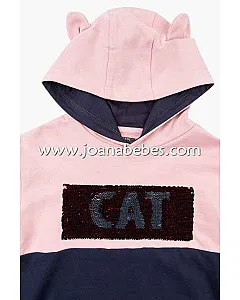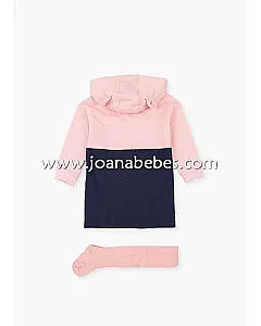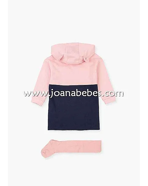 Conjunto de vestido con lentejuelas reversibles y leotardo para niña. Conjunto de vestido en tejido de felpa perchada con capucha con detalle de orejitas, forrada en tejido de punto. Con tejido de canalé en puños. Combinada en dos colores, rosa y azul marino. Y leotardo básico de tricotosa en color rosa palo.