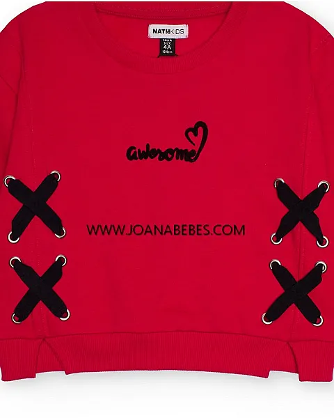Sudadera para niña en color rojo vibrante, con diseño de manga larga y escote redondo. Destaca por su original adorno de lazos cruzados en negro a ambos lados del delantero, sujetos con ojales metálicos que le aportan un toque moderno. El texto “awesome” bordado en el pecho completa el estilo urbano y desenfadado de esta prenda cómoda y llamativa, ideal para el día a día.