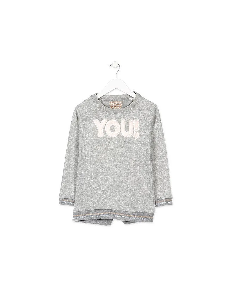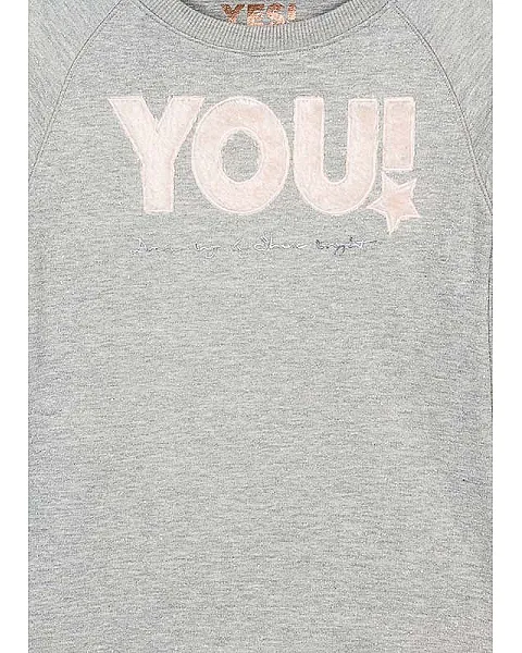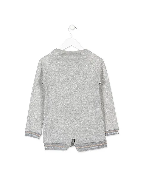 Vestido de felpa con hilo metalizado para chica. Vestido de manga larga de felpa de color gris con manga ranglan. Parche de pelo en el pecho de color rosa. Tejido de canalé en cuello, puños y bajo con rayas de hilo metalizado.