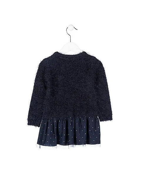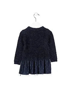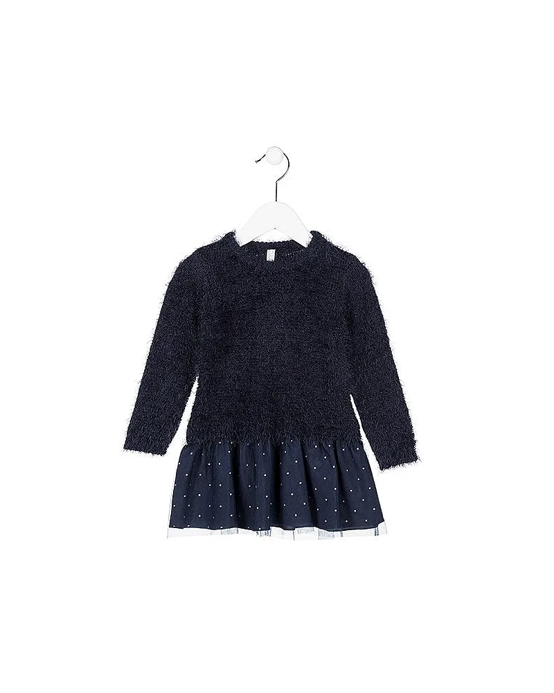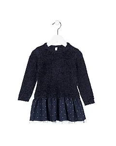 Vestido de color azul combinado para niña. Vestido de manga larga de pelo de fantasía con parche en forma de corazón estampado en el pecho. Y falda en tejido voile de estrellitas de color plata con volante de tul.