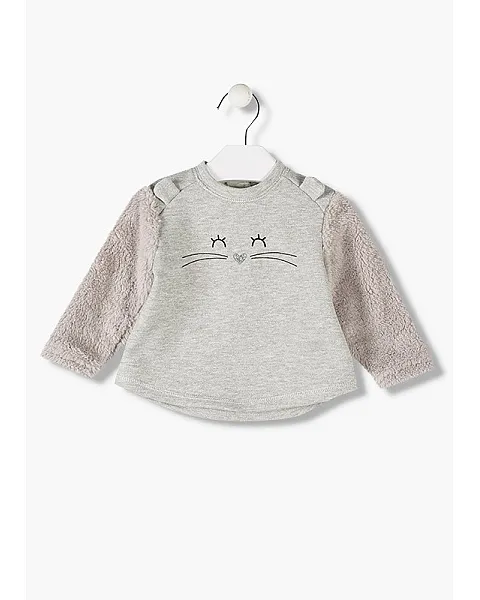 Sudadera de felpa con magas de pelo sintético para bebé niña. Sudadera de color gris con orejitas en las sisas. Cuello redondo. Cara de...