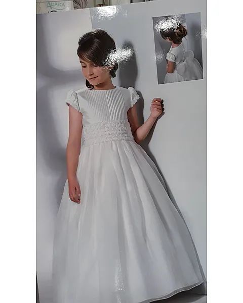 Vestido comunión clásico con lorzas, de talle normal, en seda italiana en color natural. MEDIDAS: Cuello 34cm, talle delante 34cm, talle espalda...