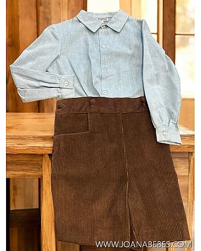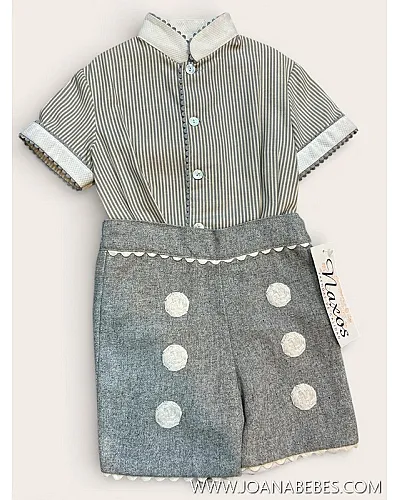 Conjunto niña short y blusa naxos. La blusa es de tela de rayas blancas y camel, manga al codo, cuello mao con piculina camel y botones de...