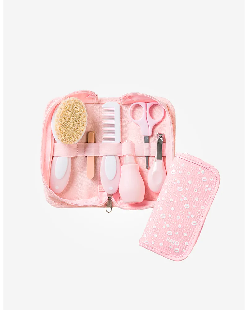 Completo neceser con todo lo necesario para el aseo del bebé en un práctico estuche con cremallera.