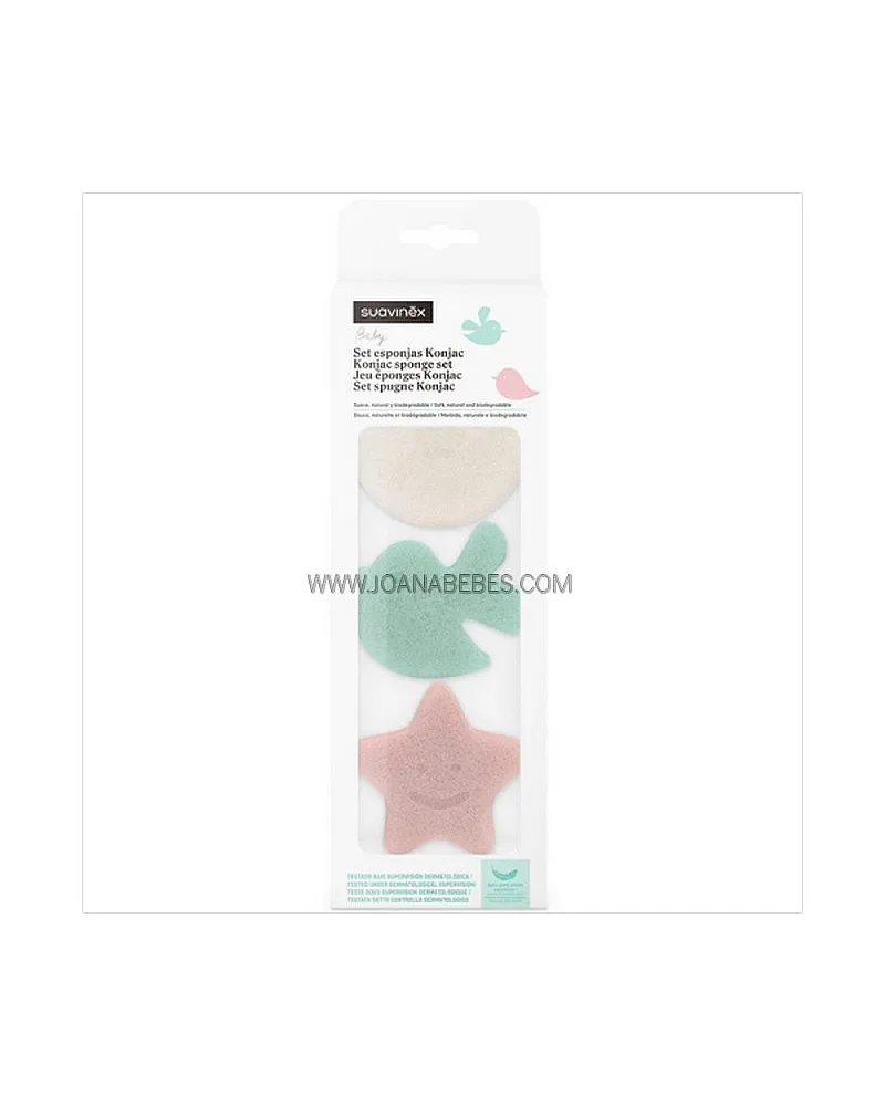 Pack de 3 esponjas de baño konjac para bebés recién nacidos, +0 meses. Aptas también para toda la familia.Cuando se mojan, adquieren una textura supersuave y agradable.Elaboradas a partir de la raíz de Konjac, una raíz asiática milenaria muy utilizada en las rutinas de limpieza facial.Contiene 3 esponjas:Esponja con forma de estrella, con extracto de rosa mosqueta.Esponja con forma de pajarito, con extracto de aloe vera-Esponja redonda, natura. Las esponjas konjac son aptas para pieles sensibles y están testadas bajo supervisión dermatológica.¿Cómo se usan?Justo antes de usarla, mójala con agua templada para que absorba el agua y se vuelva blanda y suave. Puedes añadir jabón y crear espuma masajeando la esponja.