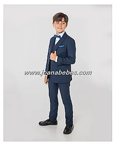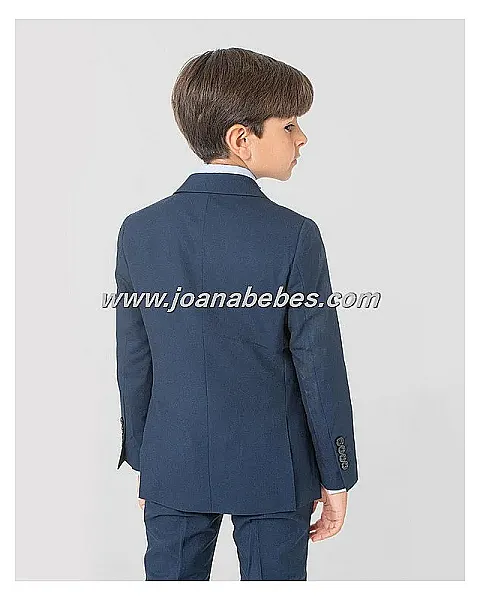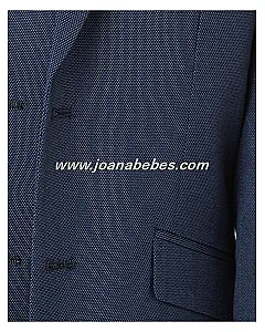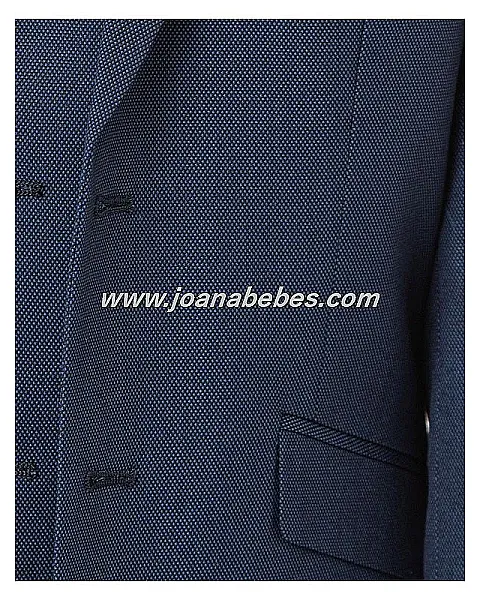 Americana de traje para niño confeccionada en tejido estructura con cuello y solapa de cierre central simple, con manga de botones en los puños, bolsillo de ojal en el pecho y dos bolsillos de solapa en la cintura. Aberturas en la espalda.