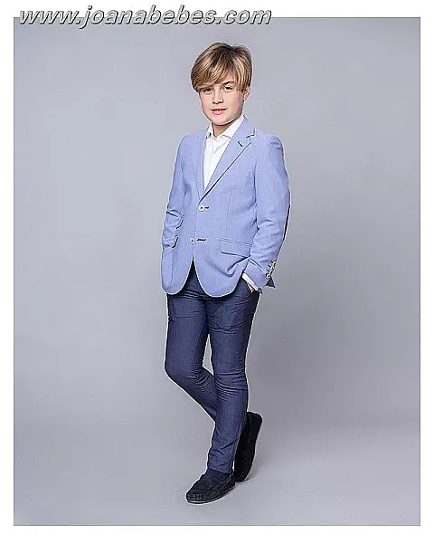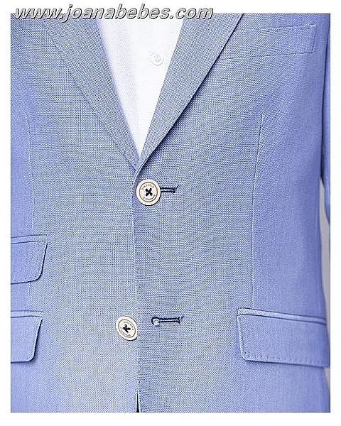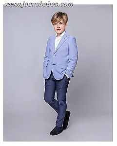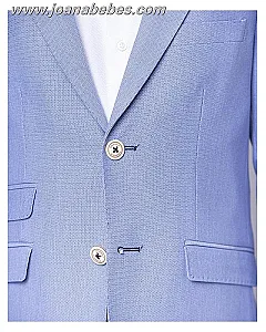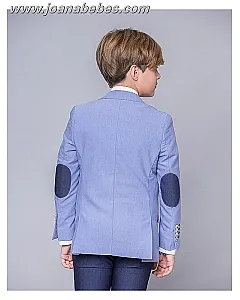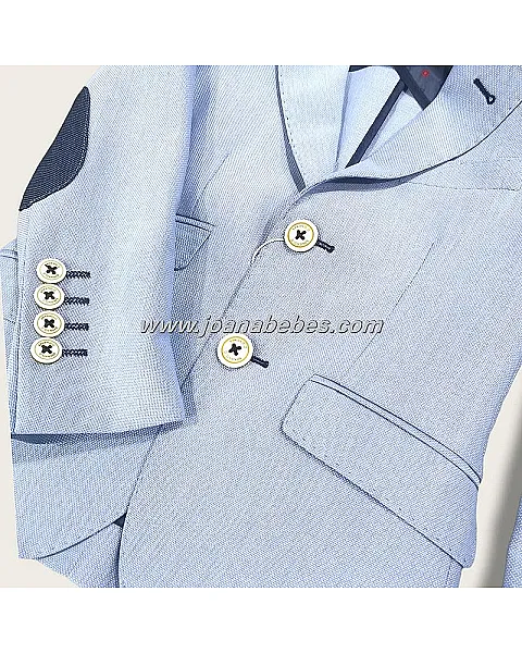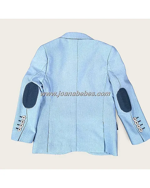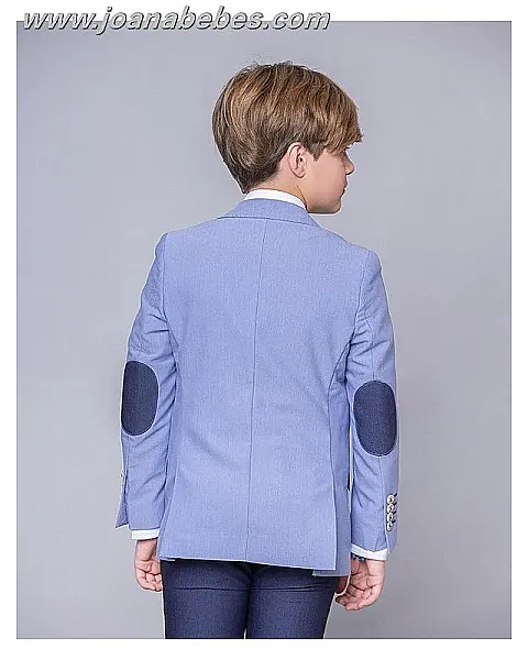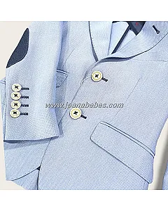Americana de niño confeccionada en tejido estructura. Cuenta con cuello y solapa, cierre central mediante dos botones, pinza de entalle en el frontal y manga larga con botones en los puños. Bolsillo de ojal en el pecho, dos bolsillos de solapa en el frontal. Forro interior y bolsillos en el interior. Aberturas en la espalda y pespuntes a contraste. Personalizada con coderas a contraste.