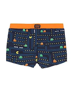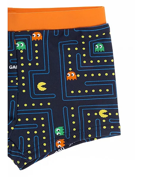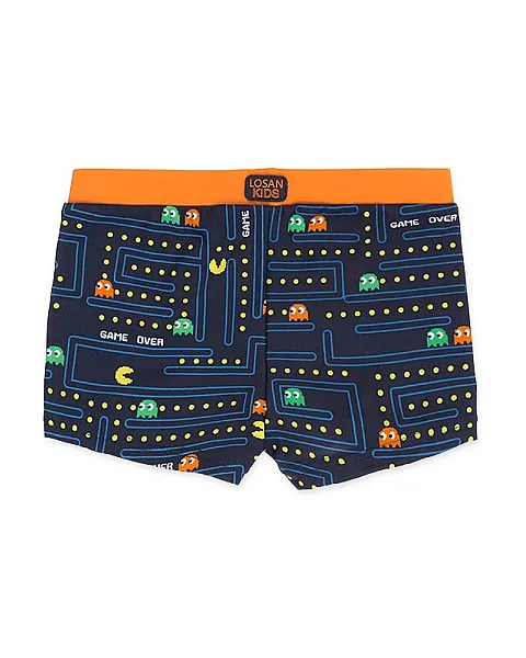 Bóxer de baño con estampado de juego electrónico para niño. Bóxer de baño con cinturilla de color naranja elástica y cordón interior ajustador. Etiqueta de goma personalizada de marca Losan en la parte posterior de la cintura.