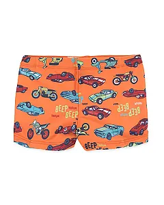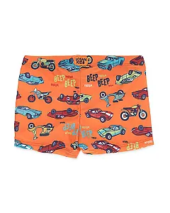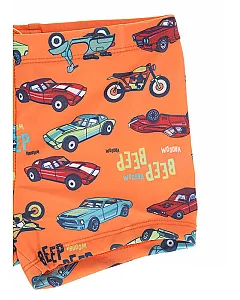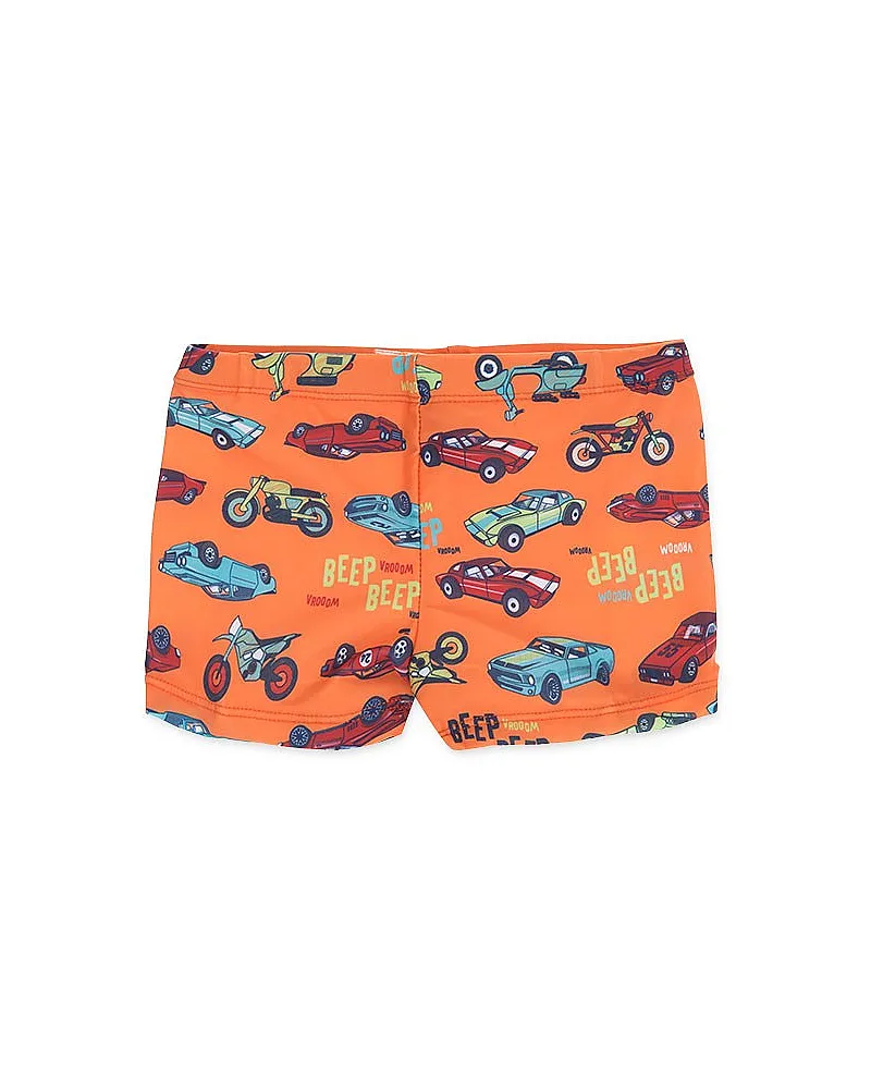 Bóxer de baño con coches estampados para niño. Bóxer de baño de color naranja con cintura elástica y cordón ajustador interior. Etiqueta de goma personalizada de marca Losan en la parte posterior de la cintura.