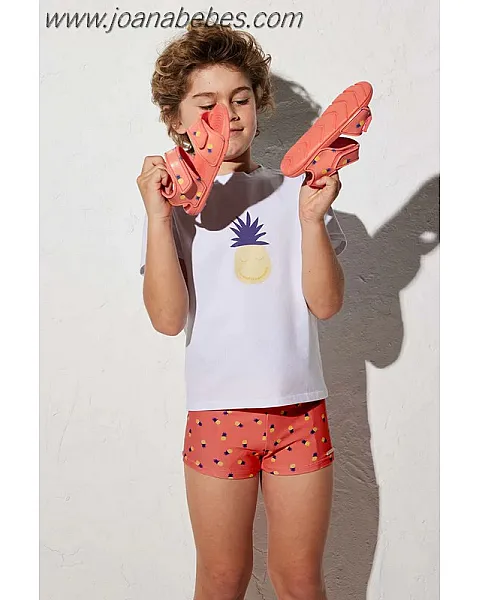SET CAMISETA BLANCA Y BAÑADOR NIÑO CON ESTAMPADO DE PIÑAS