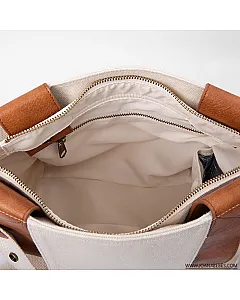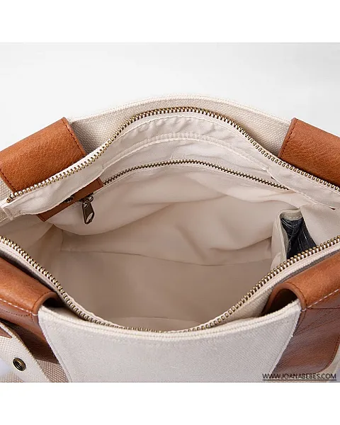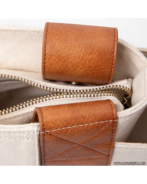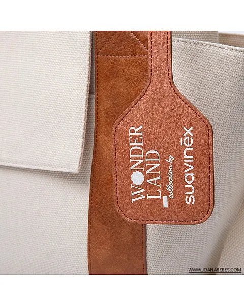 5 bolsillos interiores: 3 bolsillos pequeños sencillos, 1 bolsillo más grande con cremallera, 1 bolsillo térmico con goma para sujetar objetos, ideal para transportar de pie el biberón, papillero o tarrito sin que vuelque.