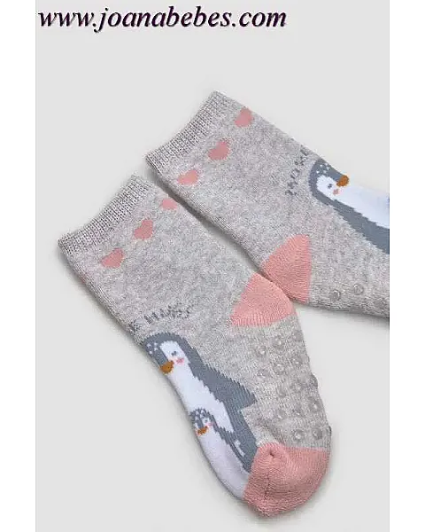 Pack de 2 calcetines térmicos antideslizantes para bebé tejidos en algodón. Diseños invernales con pingüinos en colores suaves con puño especial antipresión.
