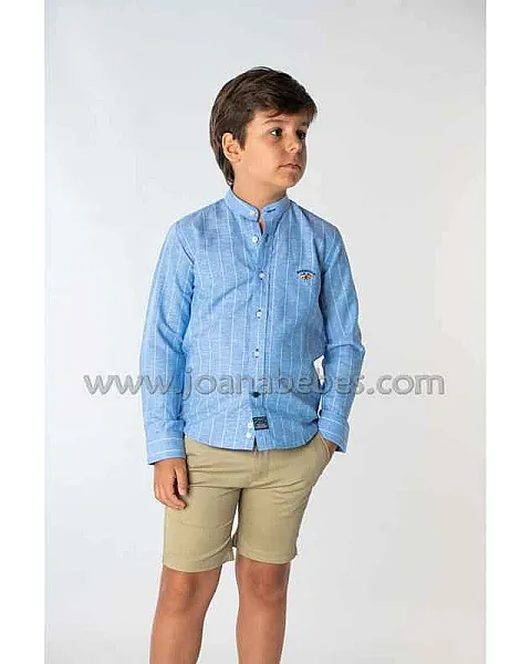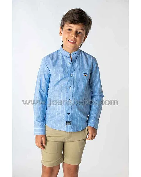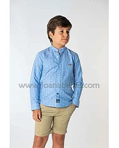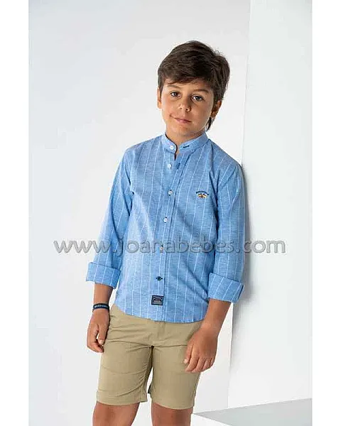 Camisa manga larga cuello mao. Tejido lino rayas, con bordado bandera en el pecho a contraste.