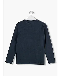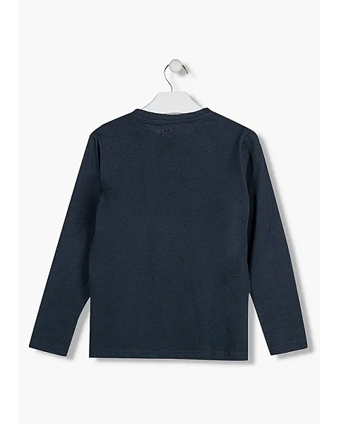 Camiseta de color azul de algodón para chico. Camiseta de manga larga con cuello redondo en tejido de canalé. Estampado con rotos en el delantero en colores blanco y amarillo.