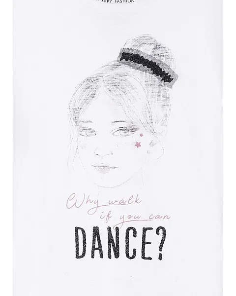 Camiseta con rostro estampado para chica. Camiseta de manga larga de color blanco y cuello redondo. Detalles en el estampado con purpurina. Tejido de tul en el moño.