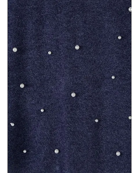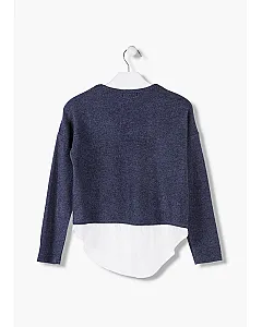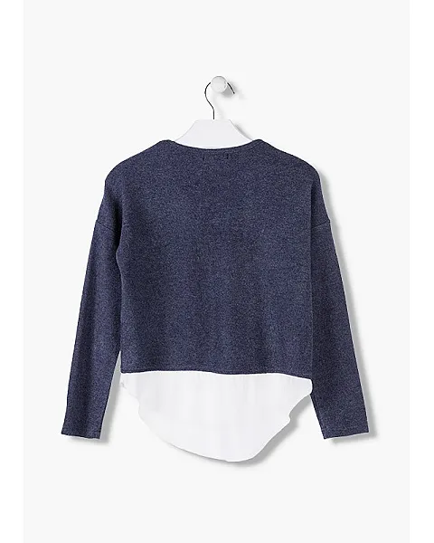 Camiseta de manga larga con perlitas para chica. Camiseta de color azul con pieza de color natural en el bajo en tejido voile. Cuello redondo.