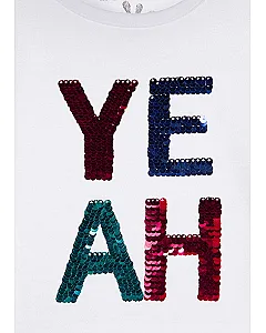 Camiseta con mensaje de lentejuelas para niña. Camiseta de manga larga de color blanco en tejido de algodón con cuello redondo. Pespuntes al tono. Lentejuelas reversibles en el delantero.