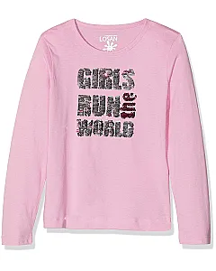 Camiseta con mensaje de lentejuelas para niña. Camiseta de manga larga de color chicle en tejido de algodón con cuello redondo. Pespuntes al tono. Lentejuelas reversibles en el delantero.
