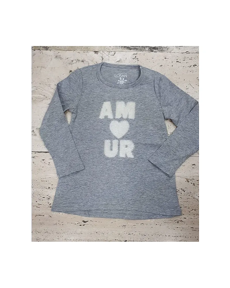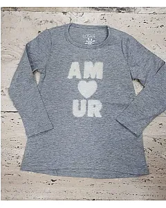 Camiseta  de algodón para niña. Camiseta de manga larga de punto con cuello redondo y con parche de letras y corazón en tejido de pelo de color BEIG.