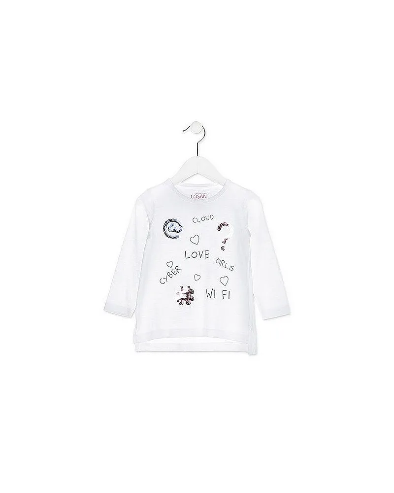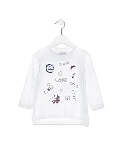 Camiseta de punto de color rosa para niña. Camiseta de manga larga de algodón con formas estampadas y lentejuelas de color plata y dorado en el delantero formando estrellas, rayos y signo de exclamación.