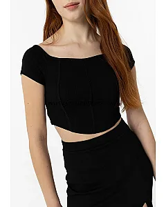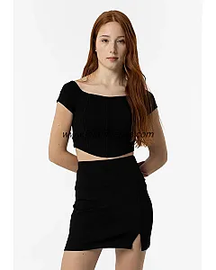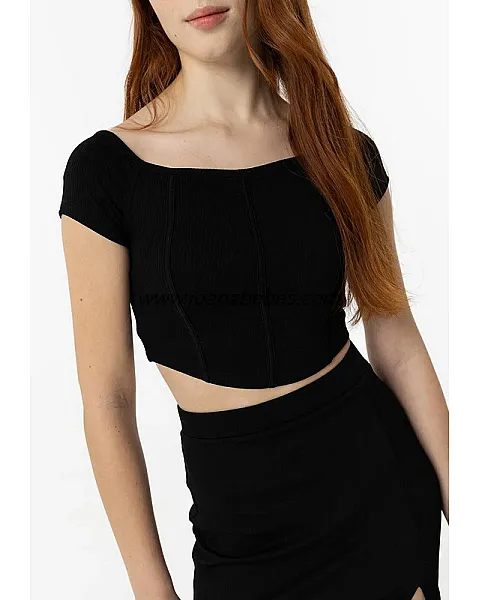 Camiseta de manga corta abullonada y cuello redondo. Texto bordado frontal.