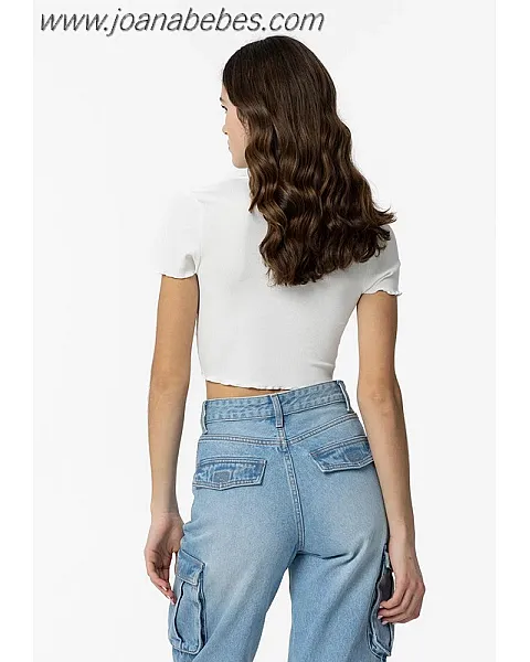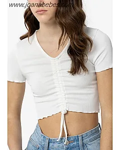 Camiseta de escote pico con frunces ajustable y manga corta. Bajo y mangas acabado con ondas.