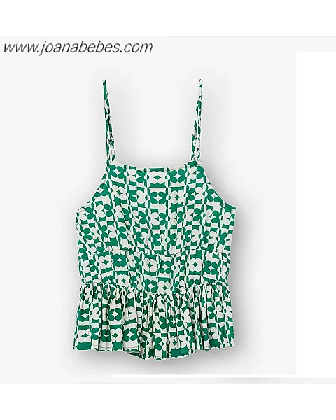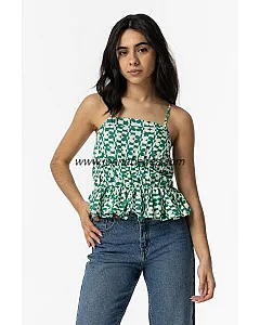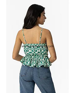Top de escote recto y tirantes finos ajustables. Estampado all over. Detalle elásticos y volantes.