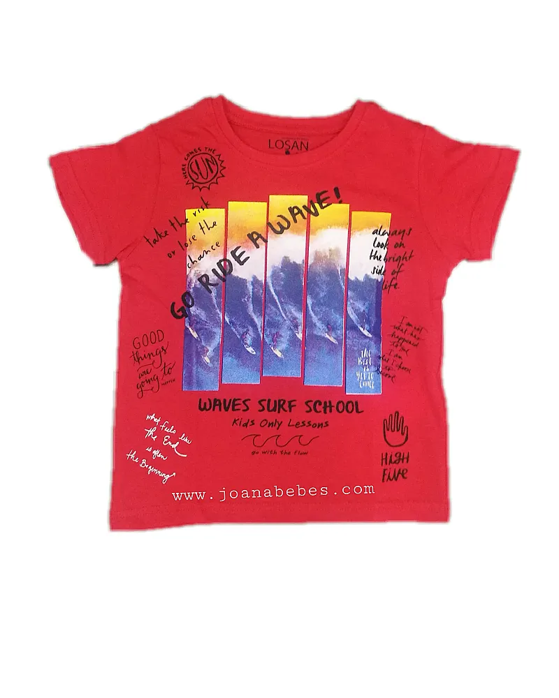 Camiseta con mensajes estampados para niño. Camiseta de manga corta con cuello redondo en tejido de canalé de color blanco. Estampado surfero en el delantero.