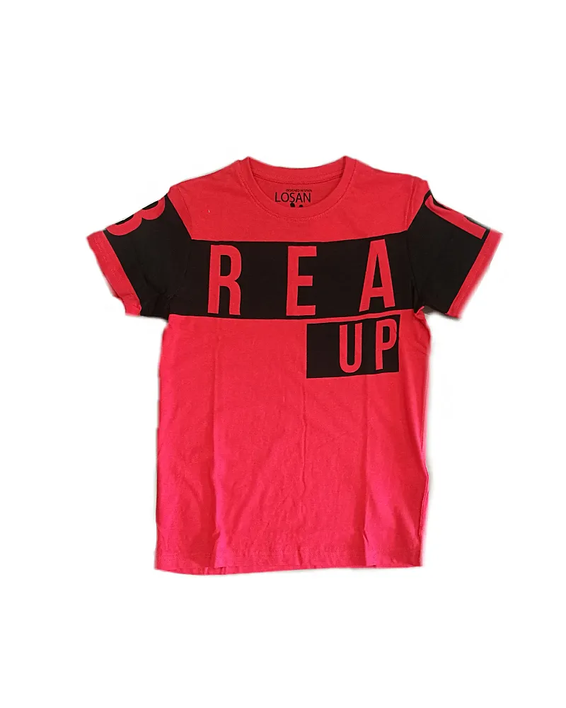 Camiseta de color rojol con estampado para chico. Camiseta de punto de manga corta con cuello redondo en tejido de canalé. Estampado de color negro formando letras en el delantero y en las mangas.