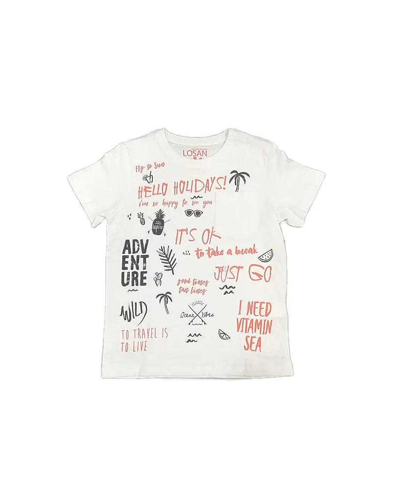 Camiseta de manga corta con lentejuelas reversibles para niño. Camiseta de algodón toda estampada con textos. Cara en el delantero...