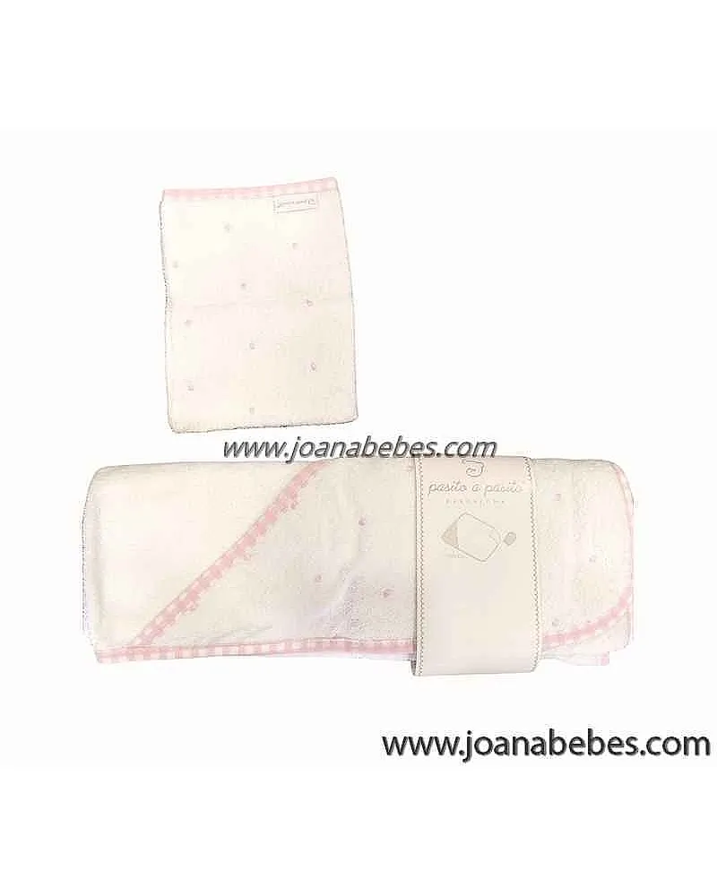 Capa de baño con manopla 100% algodon medidas 75x75, con bodoques bordados en rosa y rematado con el filo en vichy rosa.