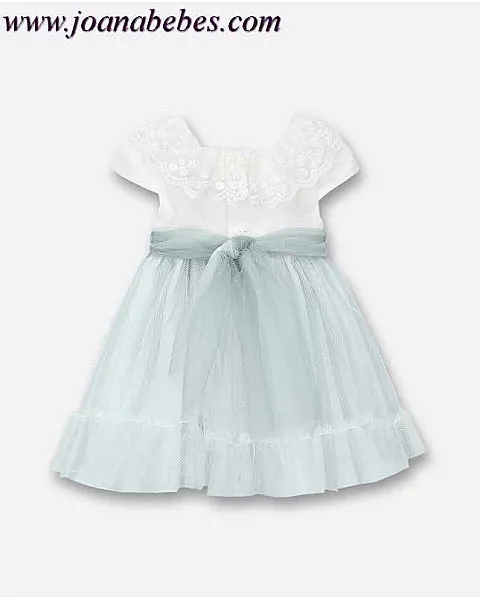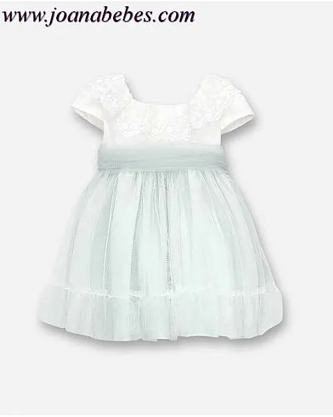 Vestido de bebé en manga corta, escote cuadrado con volante de puntilla bordada. Cuerpo del vestido en tul crudo, falda y fajín en tul verde agua. Cierre por detrás mediante botones de nácar. En el interior de la falda cuenta con una capa de tul para darle mayor volumen a la falda.