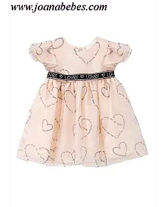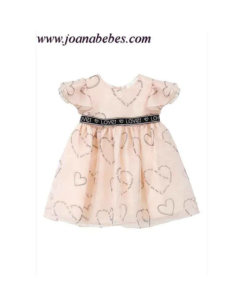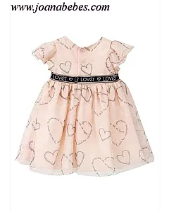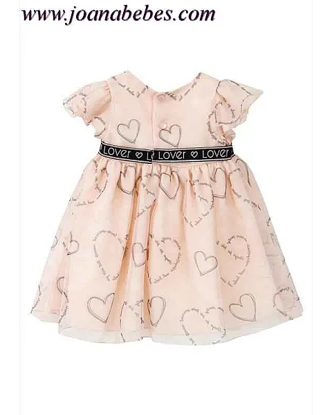 Vestido de bebé niña en organza natural de color rosa con estampación de corazones. Mangas capeadas y cuello redondo. Cierre por detrás mediante botones. Vestido con forro. En el interior de la falda cuenta con una capa de tul para darle mayor volumen a la falda.