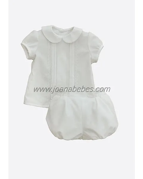 Conjunto de bebé en manga corta de tul crudo. Pantalón bombacho y camisa de cuello camisero redondo, con detalle de jaretas y puntilla bordada en delantero. Cierre por detrás mediante botones. Conjunto con forro. COMPOSICIÓN: 100% Poliéster