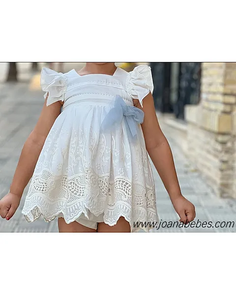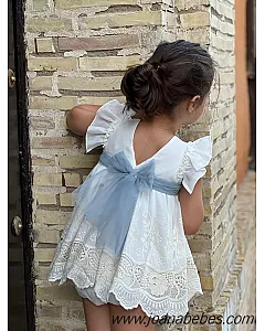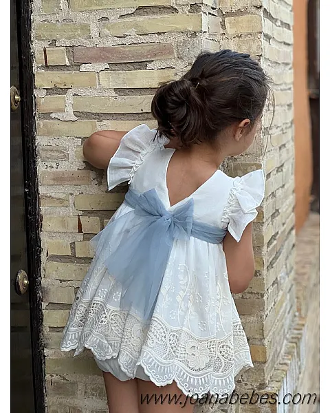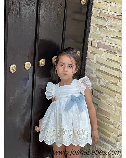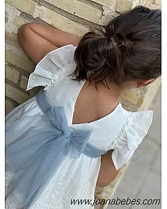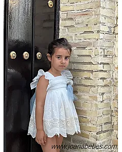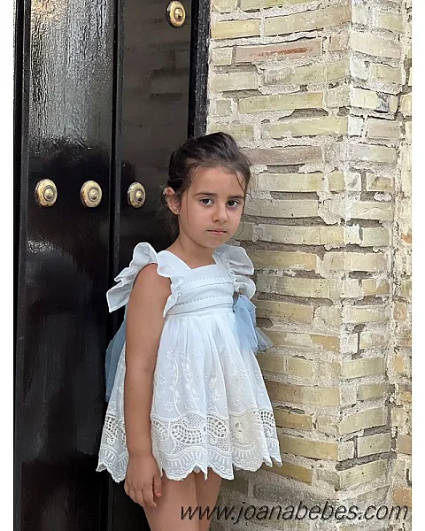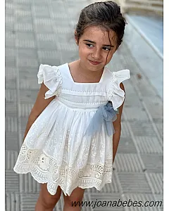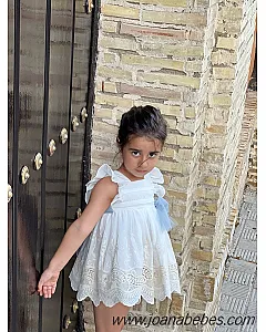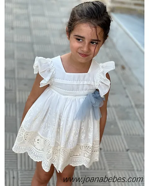 Mayoral vestido talle bajo de algodon con bonita decoracion de pedreria en el cuellov en falda y mangas son com plisado al tono del vestido.