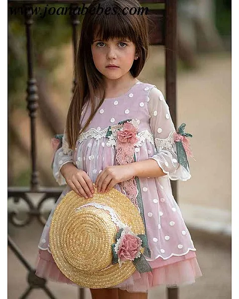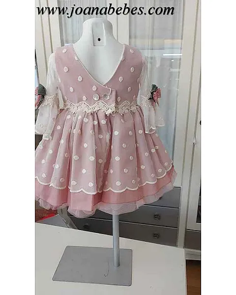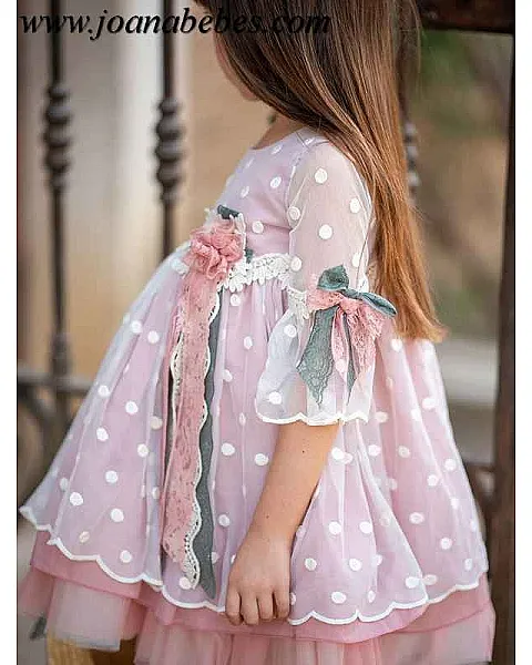 Vestido corte imperio de manga 3/4 escote redondo y decorado con puntillas de colores, confeccionado en tul bordado con base de organdí.