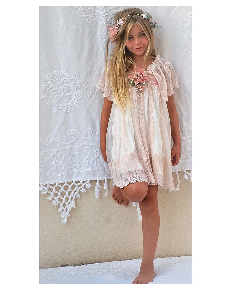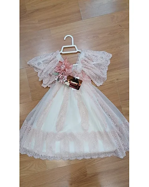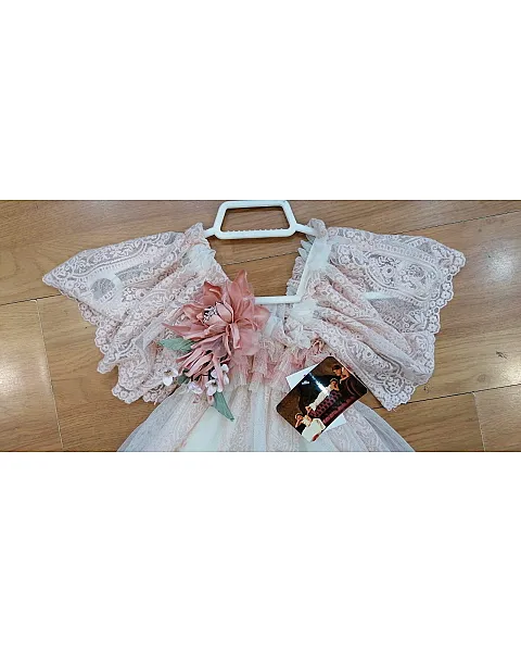 -Espectacular vestido rizadito en el pecho de tul crudo con bordado de guirnaldas de medallones rosa.