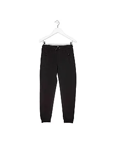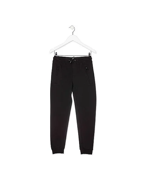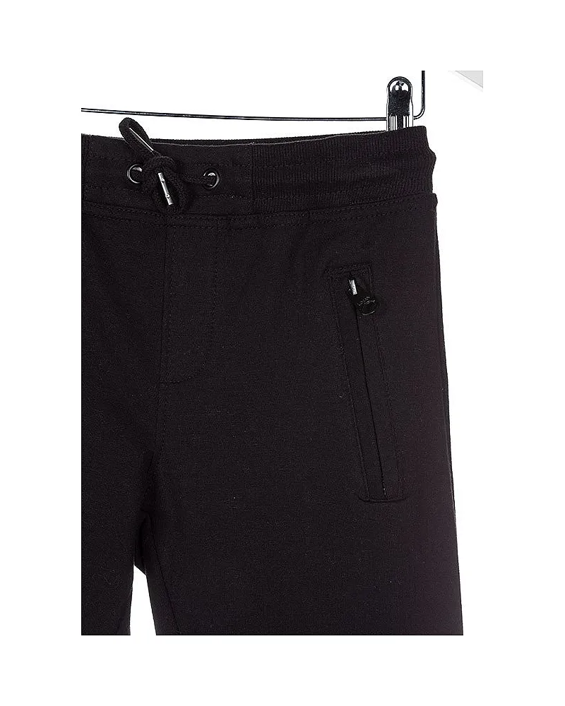 Pantalón de felpa de color negro con bolsillos para chico. Pantalón con cintura elástica en tejido de canalé, con ojales y cordón ajustador. Bragueta simulada. Bolsillos delanteros con cremalleras. Puños en el bajo en tejido de canalé. Bolsillo trasero con cremallera.
