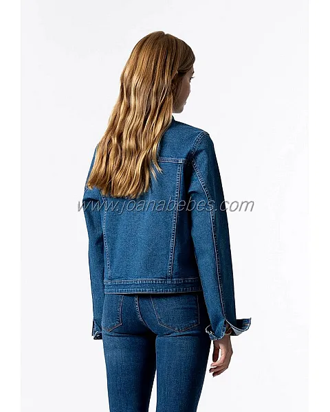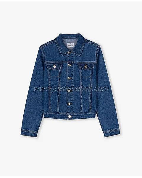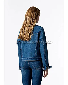 Cazadora denim de manga larga y cuello solapa. Bolsillos con solapa y botón en frontal. Cierre delantero con botones metálicos.