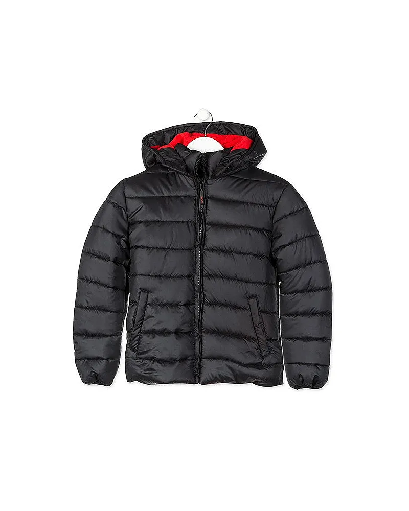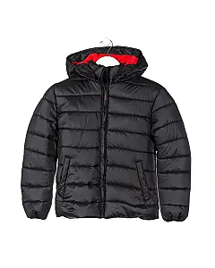 Chaqueta acolchada de color gris con capucha para chico. Chaqueta con abertura central con cremallera. Interior de tejido de forro polar de color rojo. Bolsillos en la cintura. Capucha desmontable con automático. Tirador de la cremallera de goma personalizado de marca Losan. Elástico en puños