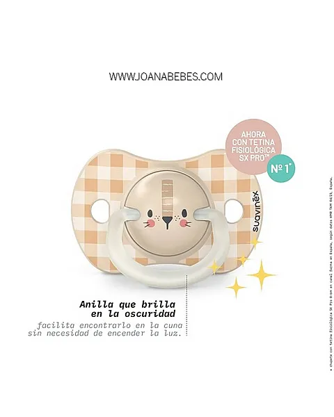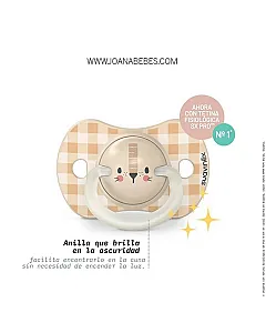 : con tetina fisiológica de silicona talla 0-6 meses. Su anilla brilla en la oscuridad, lo que lo hace el chupete ideal para dormir. ¡El bebé lo encontrará solito en la cuna!