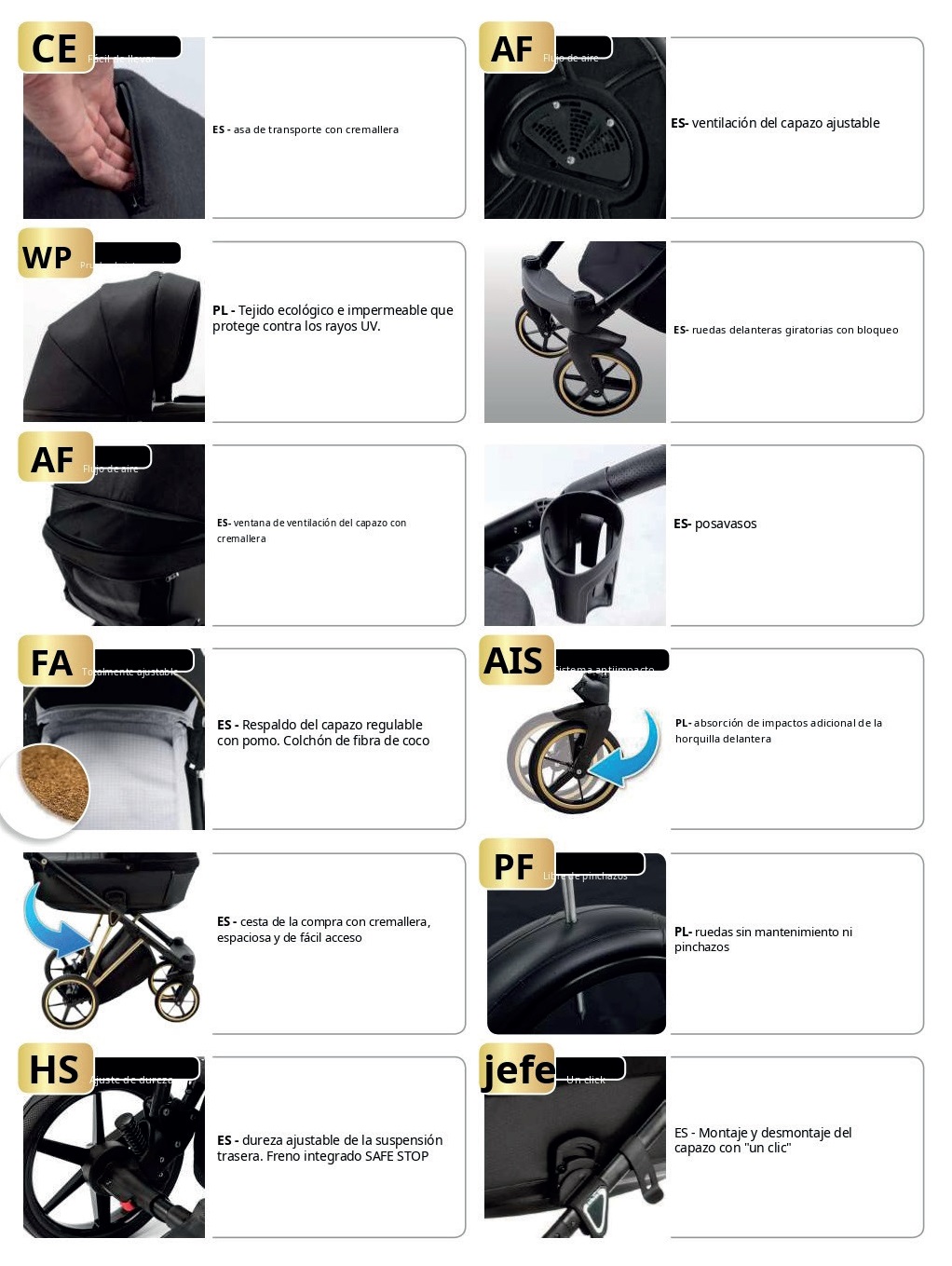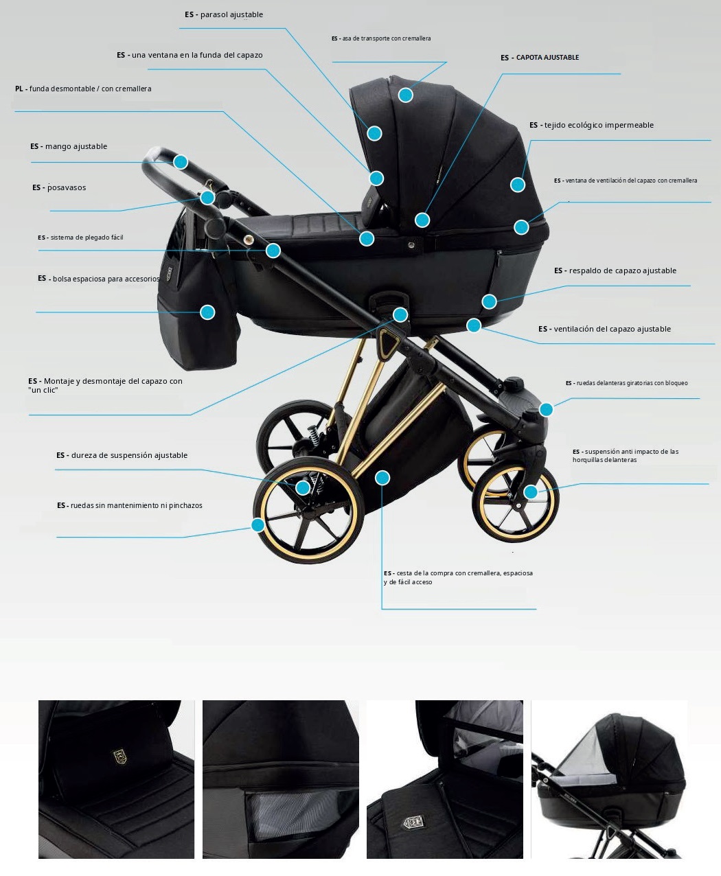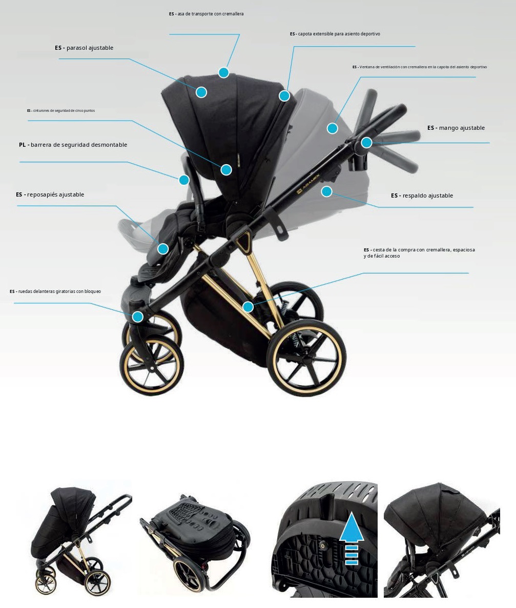 Belissa es el modelo más nuevo de cochecito de bebé multifuncional. El capazo Belissa tiene una ventana de ventilación cerrada con un imán escondido en la tapicería. La funda para los pies tiene cremallera, lo que permite un acceso rápido al niño sin quitar toda la funda. El protector contra el viento de la funda se puede desplegar o desmontar por completo si no es necesario. Mantener el contacto visual con el niño es posible gracias a la ventana transparente. El capazo tiene una ventana de ventilación adicional con cremallera y una sombrilla retráctil. El asiento deportivo de Belissa es totalmente ajustable, tiene un reposapiés extendido, una cómoda funda para los pies y cinturones de seguridad de cinco puntos. El parachoques forrado de cuero es extraíble e inclinable. La capota se puede agrandar y tiene una ventana de ventilación cerrada con una solapa. El marco del cochecito se puede plegar junto con el asiento deportivo, lo que facilita el transporte. El marco Belissa es ligero y compacto cuando está plegado. Tiene un sistema de plegado fácil, amortiguadores blandos, una cómoda cesta de la compra, ruedas tubeless sin mantenimiento, freno integrado y portabotellas.