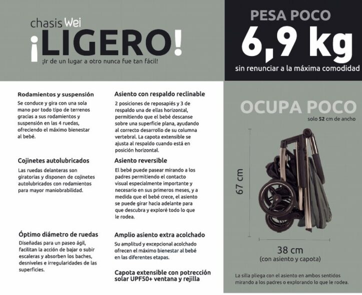 Bebecar Wei pesa poco y ocupa poco, es un carrito práctico y manejable que se adapta a las diferentes etapas del bebé del que te vas a enamorar por su diseño y prestaciones.