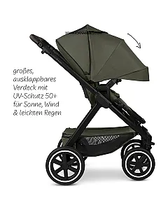 La gran capota con protección UV 50+ del Samba 2 es extensible y dispone de un parasol plegable. Una ventanilla de ventilación de malla integrada complementa perfectamente