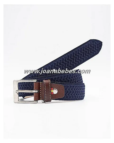 Cinturón confeccionado en serraje en color azul marino. Personalizado con detalles en piel y hebilla metálica. Presenta detalle de la bandera de España en extremo.