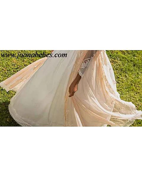 Vestido beige de tul bordado y encaje, con tonalidad melocotón.
