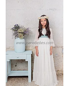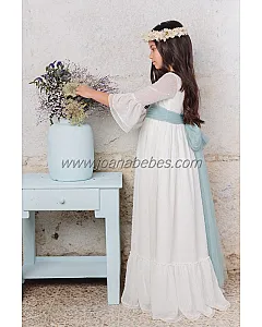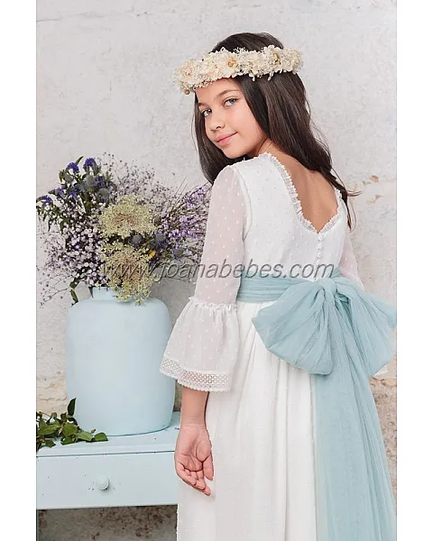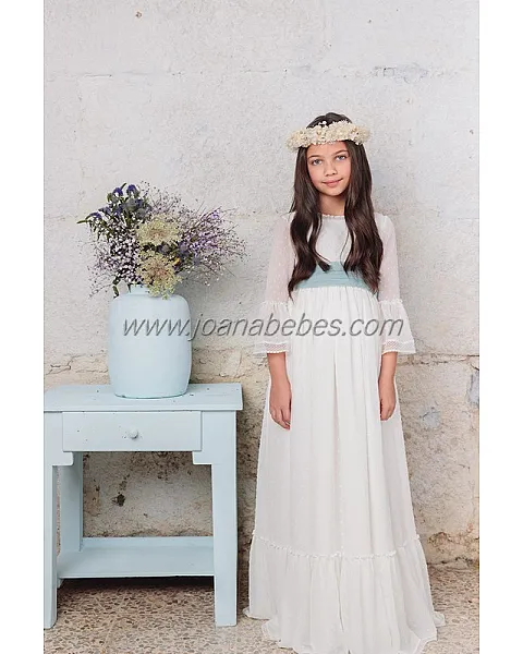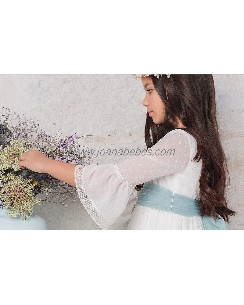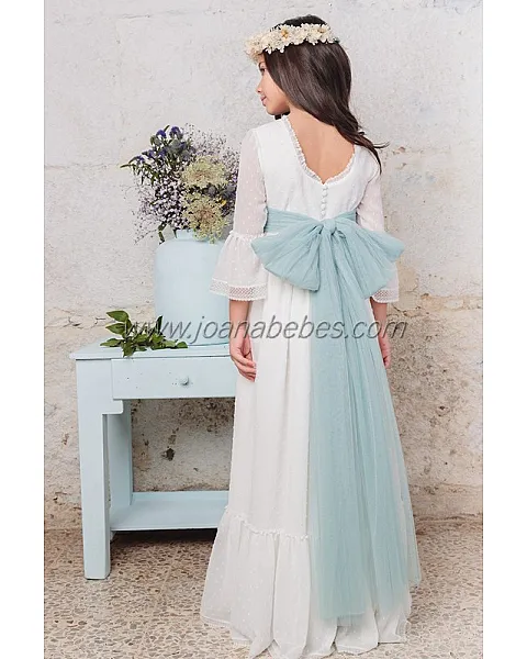 Vestido de comunión en bambula plumeti marfil, con puntilla y volante en manga y bajo. Botones forrados. Lazada tul jade con posibilidad de cambiarla. Totalmente forrado.