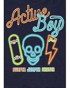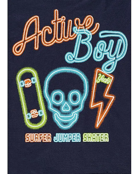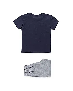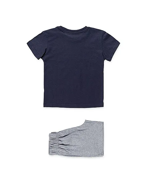 Conjunto de punto de camiseta y bermuda de color gris para niño. Conjunto de camiseta de manga corta de color azul con estampado delantero y cuello redondo en tejido de canalé. Bermuda con cintura elástica, bragueta simulada y bolsillos laterales.