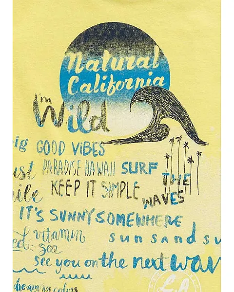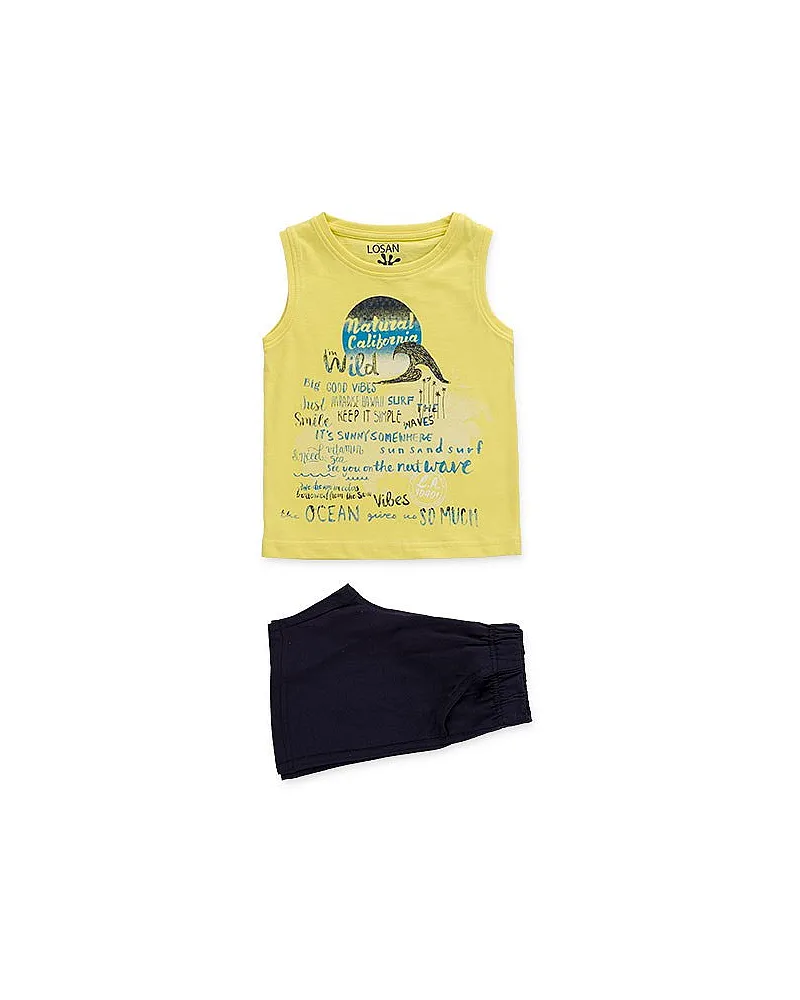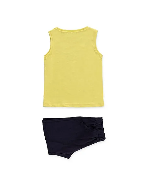 Conjunto de camiseta sin mangas y bermuda de color azul para niño. Conjunto de punto de camiseta de color amarillo con estampado playero y bermuda con cintura elástica, bolsillos y bragueta simulada.