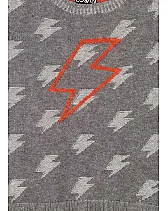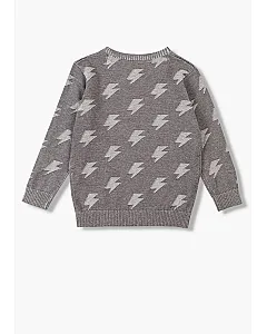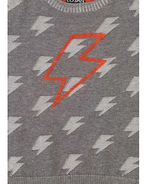Jersey con jacquard de rayos para niño. Jersey de color gris de tricotosa con cuello redondo. Estampado de terciopelo delantero. Terminaciones de canalé en cuello, puños y bajo.